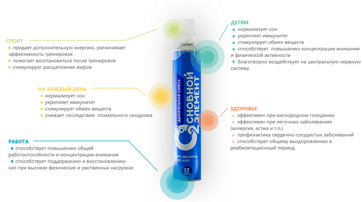 Вдох кислорода и клетки вашего организма вновь активно окисляют органические вещества, извлекают из них энергию. Больше никакой хронической усталости, быстрой утомляемости, стрессов и болезней. Чистый воздух из баллончика и ваши органы дыхания счастливы, нервная и сердечно-сосудистые системы в тонусе, больше нет астмы и аллергии.
